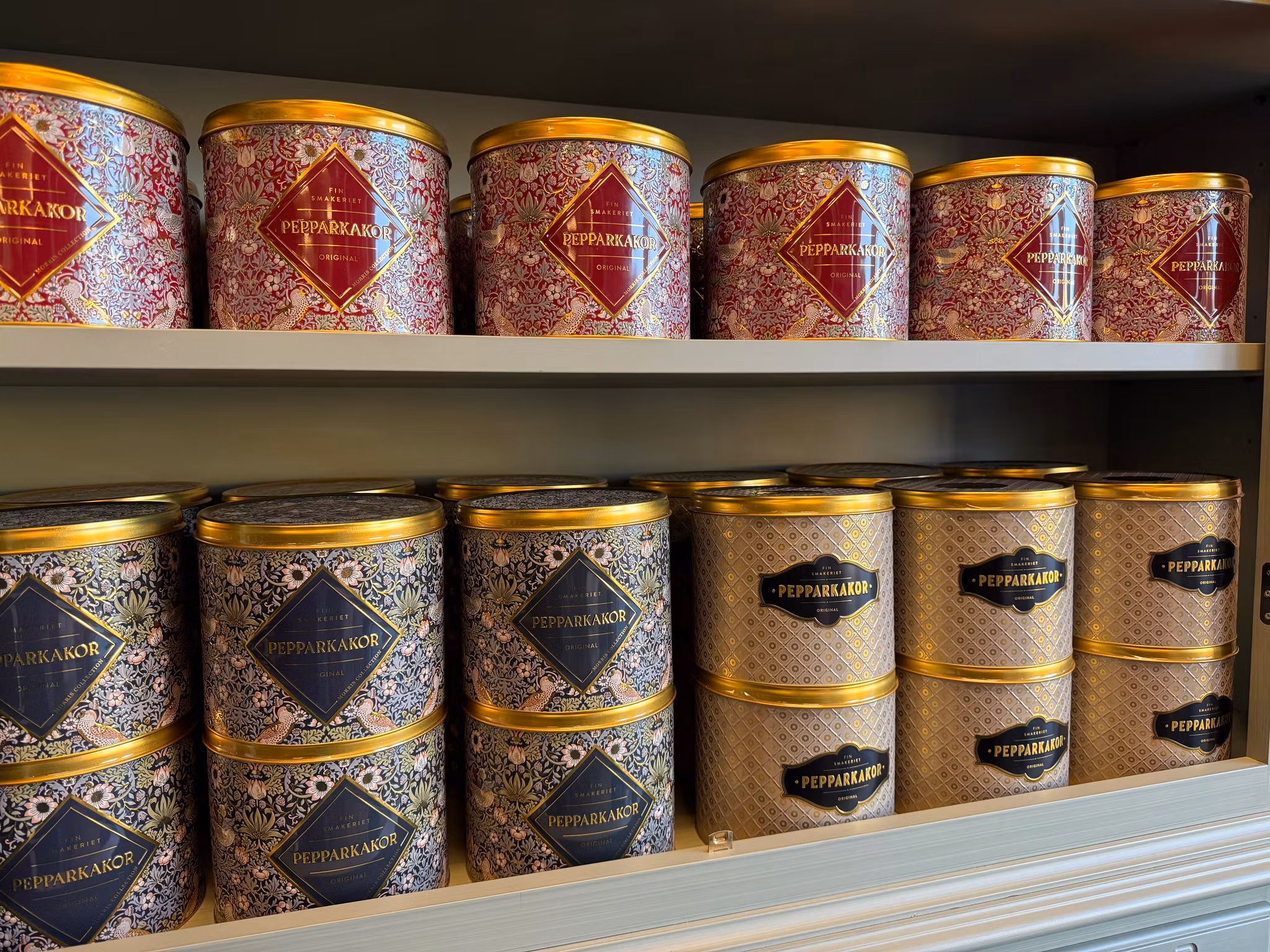 Ångbakade pepparkakor förpackade i en vacker beige plåtburk med gulddetaljer. Från Finsmakeriet.